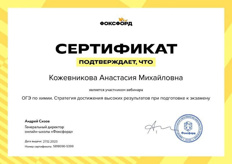 - ООО «Фоксфорд», вебинар «ОГЭ по химии. Стратегия достижения высоких результатов при подготовке к экзамену», 2024 г.