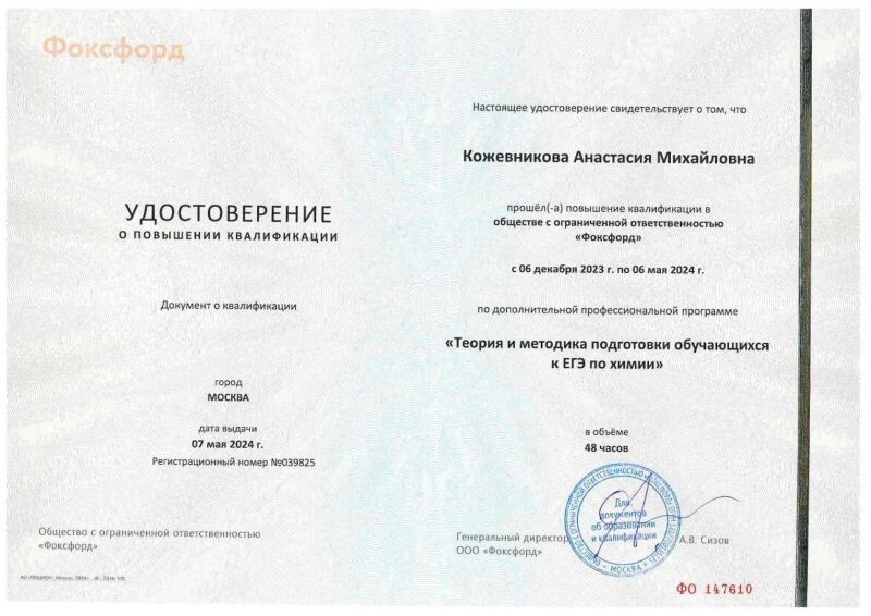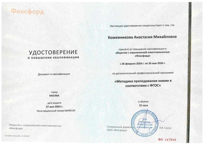 - ООО «Фоксфорд», методика преподавания химии в соответствии с ФГОС, 2024 г.