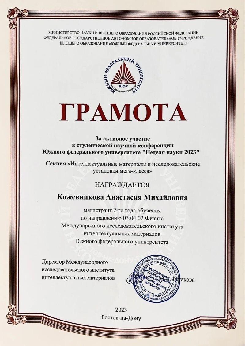 - Южный федеральный университет, за активное участие «Неделя науки 2023», секция «Интеллектуальные материалы и исследования установки мега-класса».
