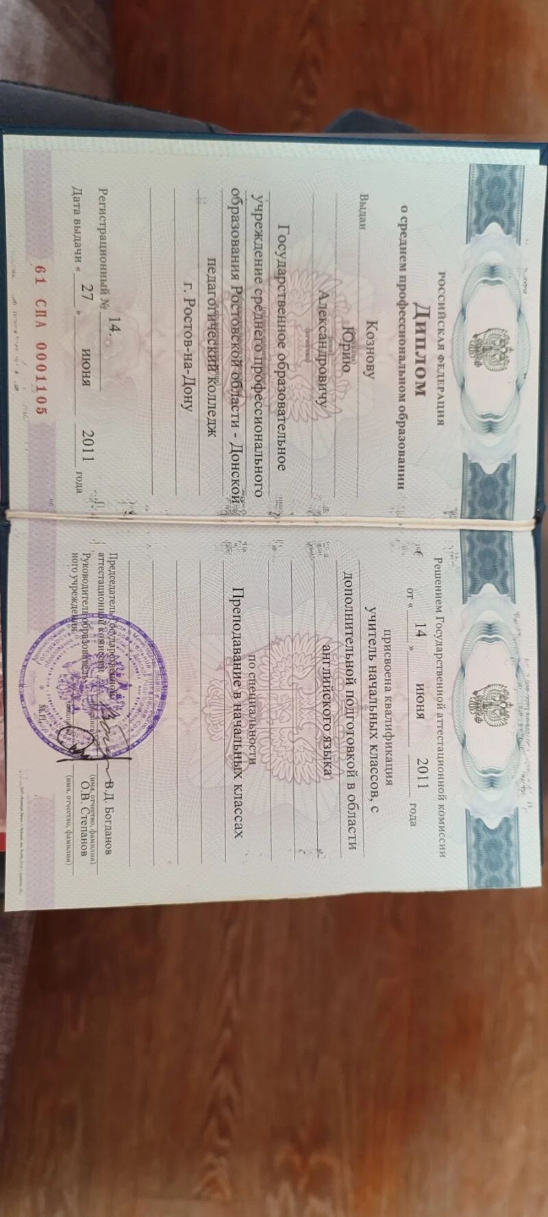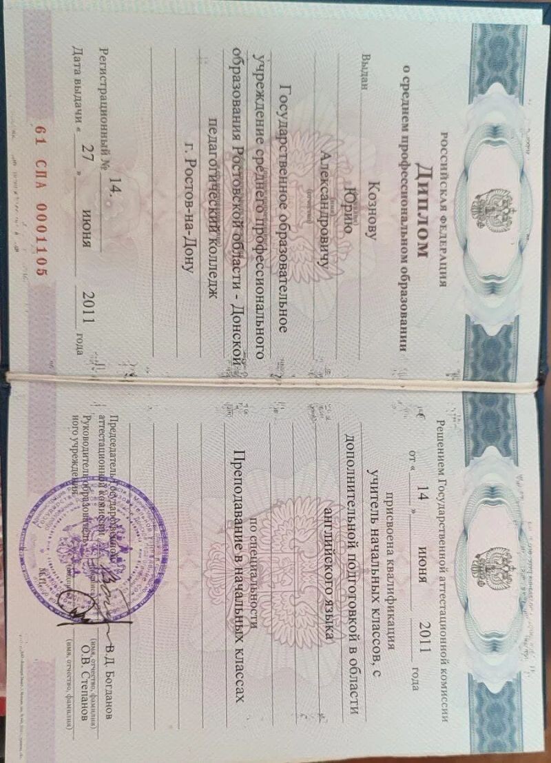 - Азовский филиал Донского педагогического колледжа, специальность – учитель начальных классов с дополнительной подготовкой в области английского языка, 2007–2011 гг.