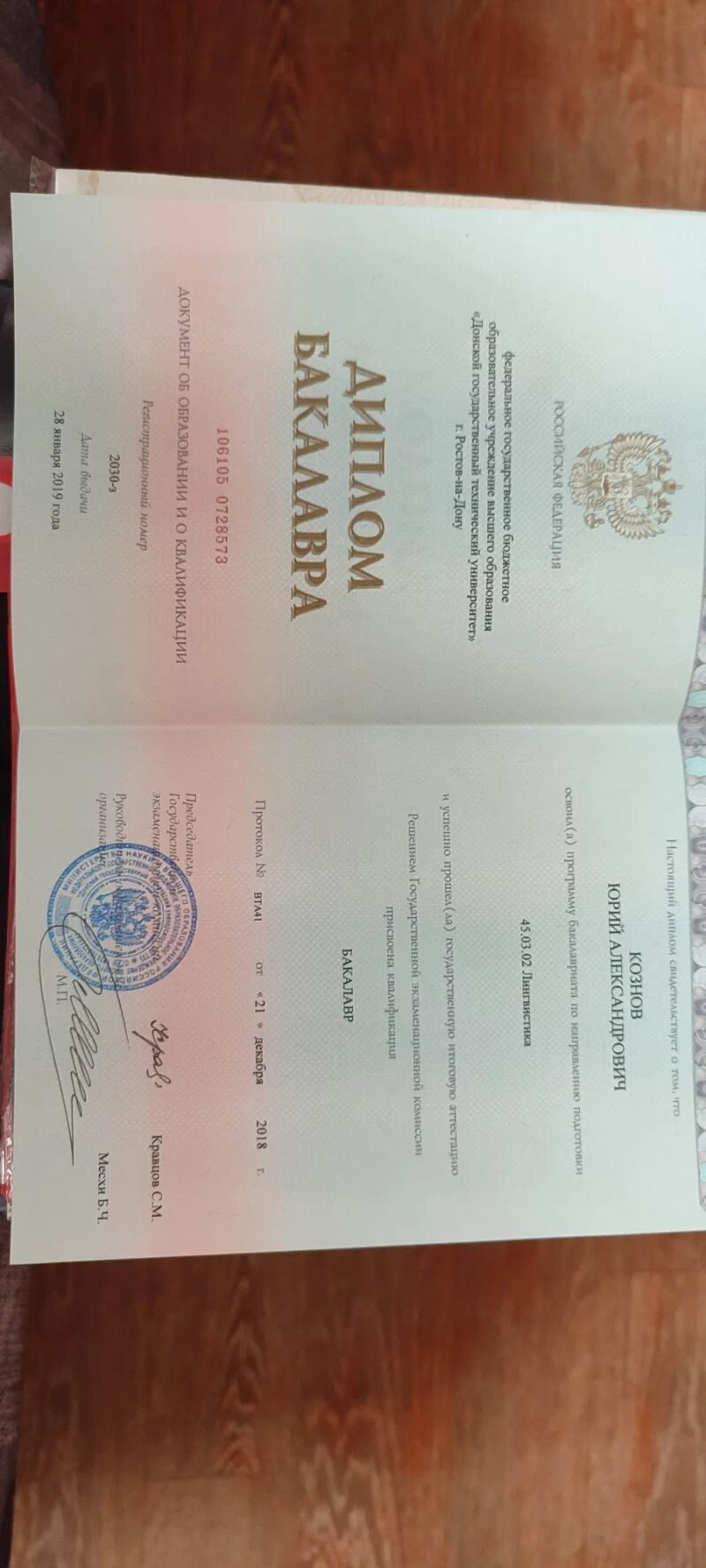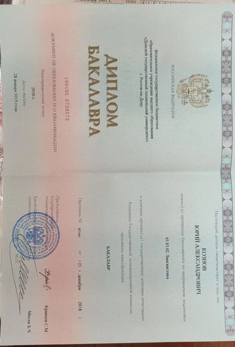 - Ростовский институт иностранных языков, филологический факультет, специальность – перевод и переводоведение, английский, испанский языки, 2014–2019 гг.