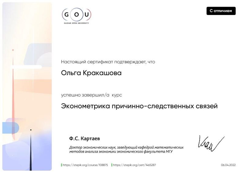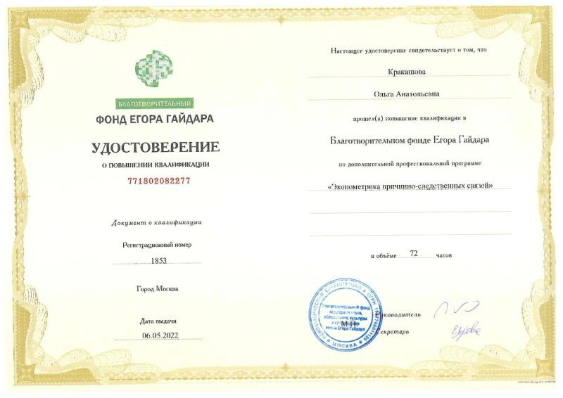 - Благотворительный фонд Егора Гайдара, повышение квалификации по программе «Эконометрика причинно-следственных связей», 2022 г.
