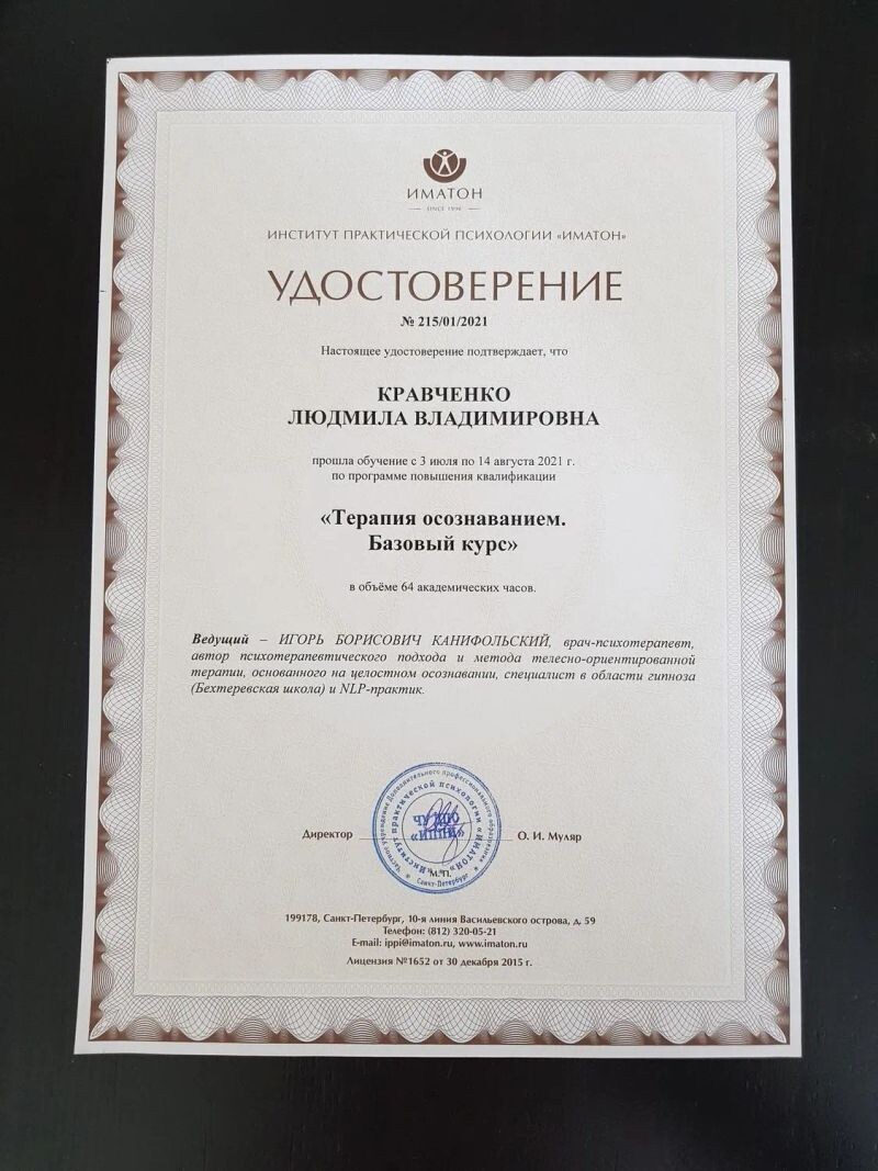 - Институт практической психологии «Иматон», программа повышения квалификации «Терапия осознаванием. Базовый курс», 2021 г.