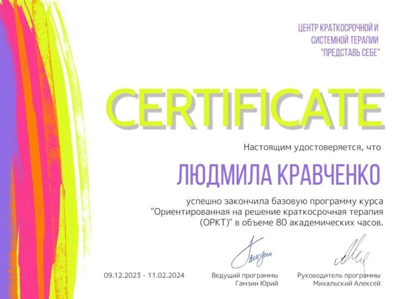- Центр Краткосрочной и системной терапии " Представь себе", ОРКТ, 80 часов, 2023–2024 гг.