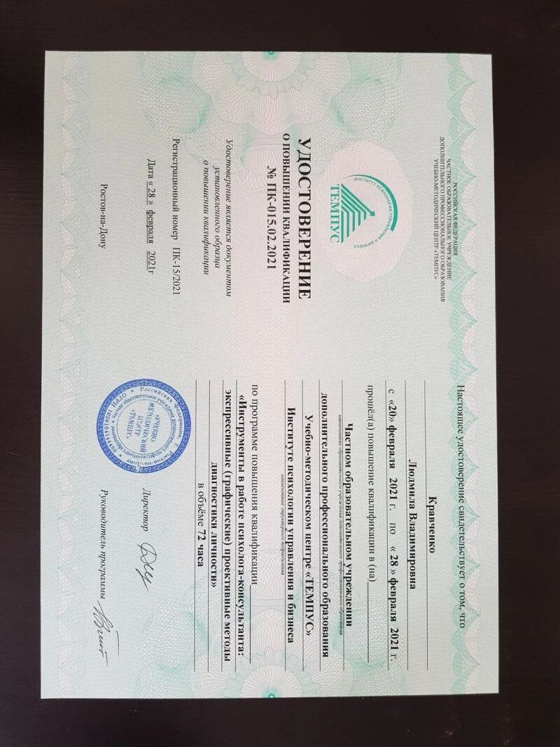 - ЧОУ ДПЛ «Учебно-методический центр «Темпус», институт психологии управления и бизнеса», программа повышения квалификации «Инструменты в работе психолога-консультанта: экспрессивные (графические) проектные методы диагностики личности», 2021 г.