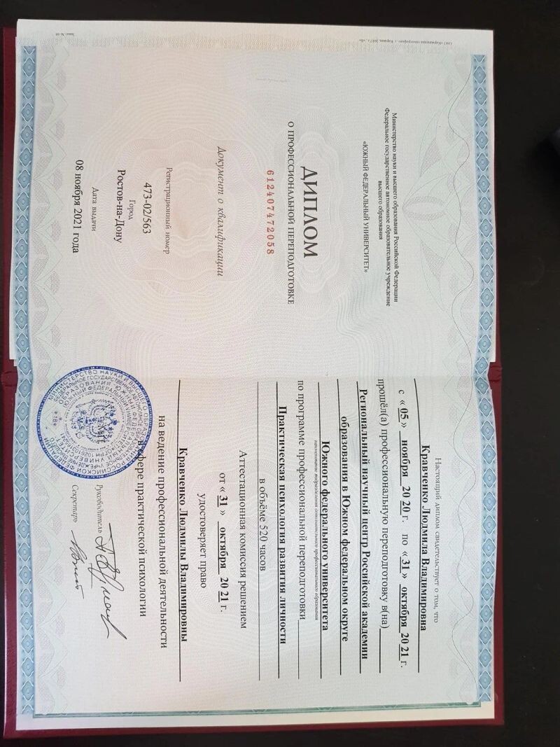 - Региональный научный центр Российской академии образования в Южном федеральном округе Южного федерального университета, программа профессиональной переподготовки «Практическая психология развития личности», 2020–2021 гг.