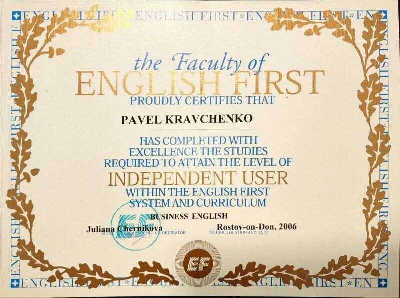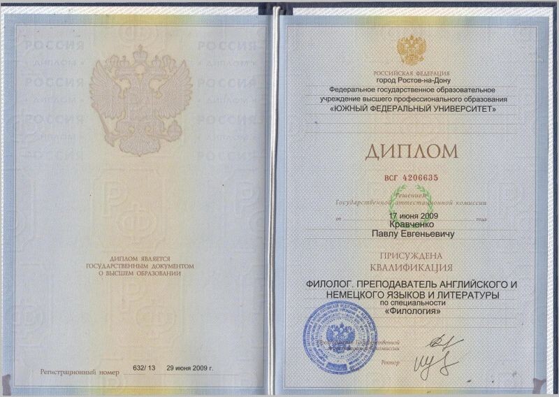- Южный Федеральный Университет, факультет романо-германской филологии, переводчик, преподаватель английского языка, 2005–2009 гг.