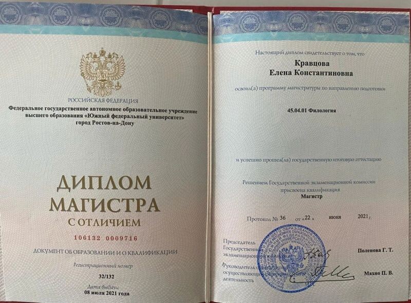 - Южный федеральный университет, ИФЖиМКК, перевод в сфере правовой и экономической коммуникации (магистратура), 2019–2021 гг.
