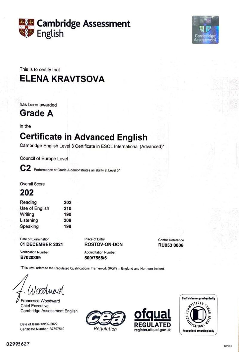 - Cambridge Assessment English, Certificate in Advanced English (C2), 2021 г.