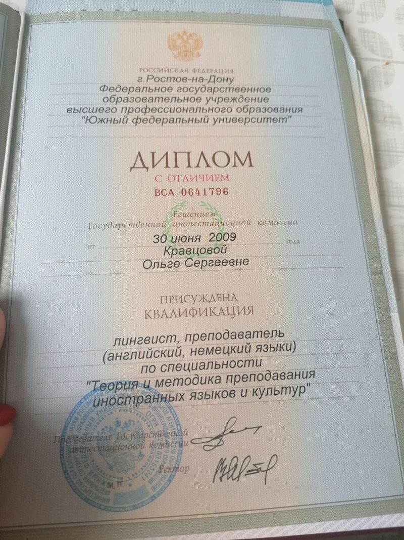 - ПИ ЮФУ, факультет лингвистики и словесности, преподаватель английского и немецкого языков (красный диплом), 2009 г.