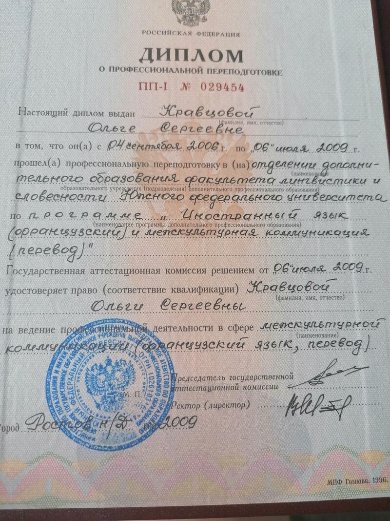 - ЮФУ, отделение дополнительного образования, программа «Иностранный язык (французский) и межкультурная коммуникация (перевод)», 2009 г.