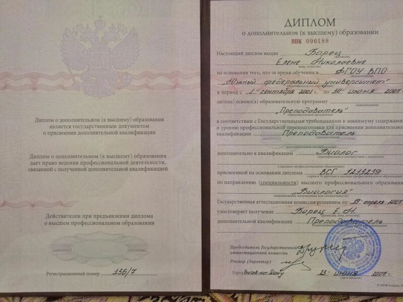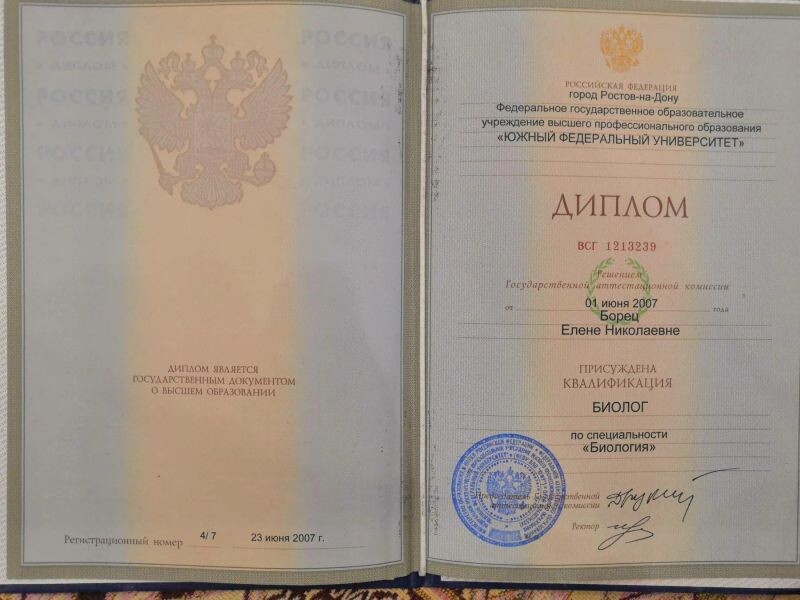- Южный федеральный университет (Ростовский государственный университет), биолого-почвенный факультет, специальность – биолог, 2001–2007 гг.