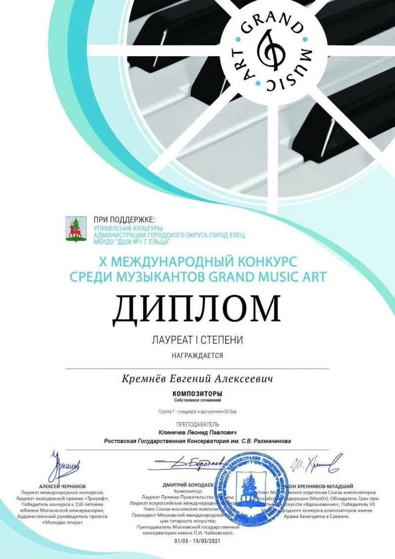 - Международный конкурс GRAND MUSIC ART, лауреат 1 степени в номинации «Композиторы, собственное сочинение», 2021 г.