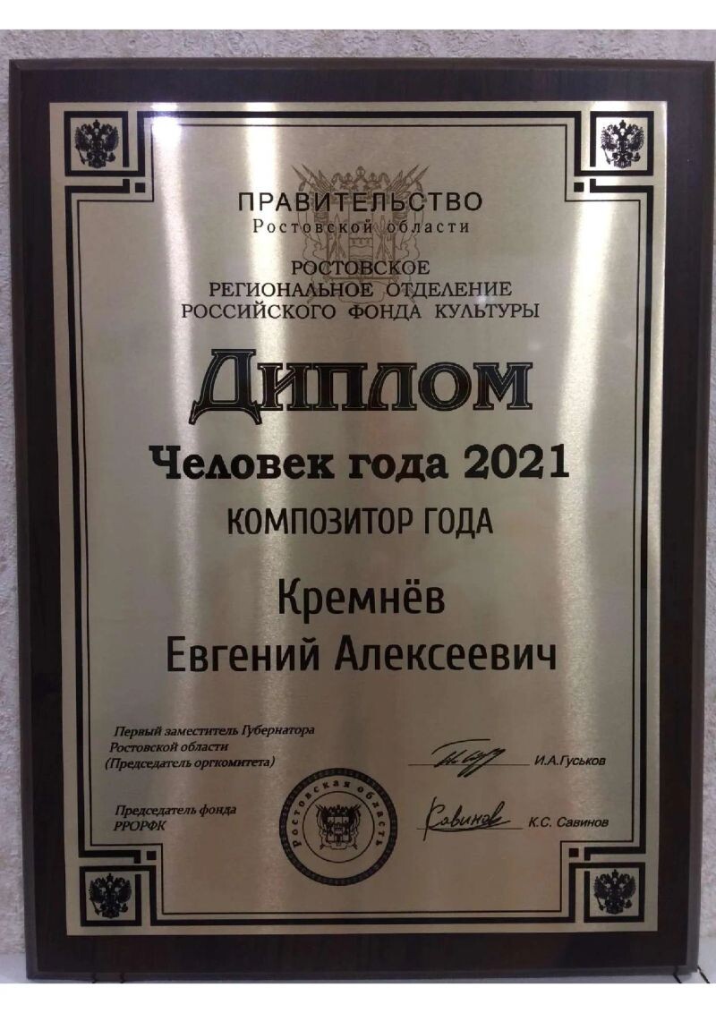 - Ростовское региональное отделение Российского фонда культуры «Человек года 2021», победитель в номинации «Композитор года«.