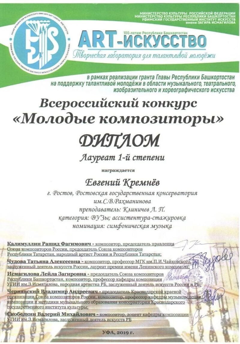 - Всероссийский конкурс «Молодые композиторы», лауреат I степени в номинации «Симфоническая музыка», 2020 г.