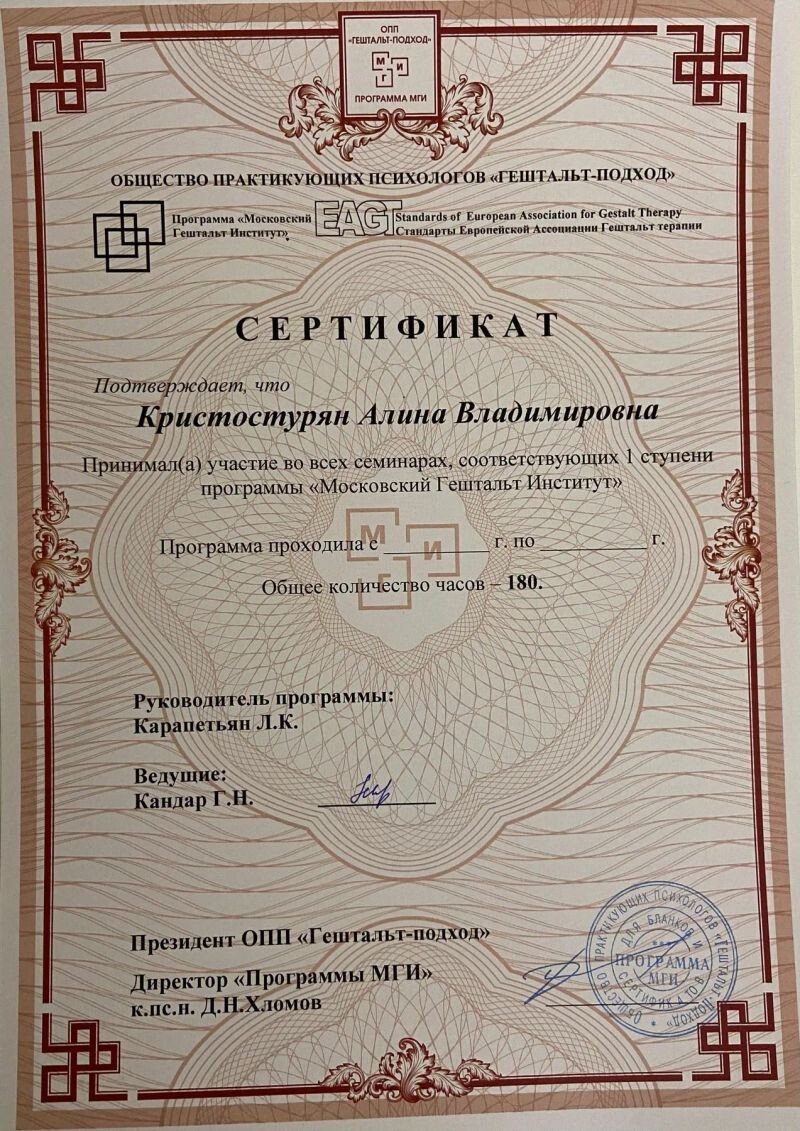 - Московский гештальт институт, программа первой ступени, основы гештальт-терапии, 2022–2024 гг.