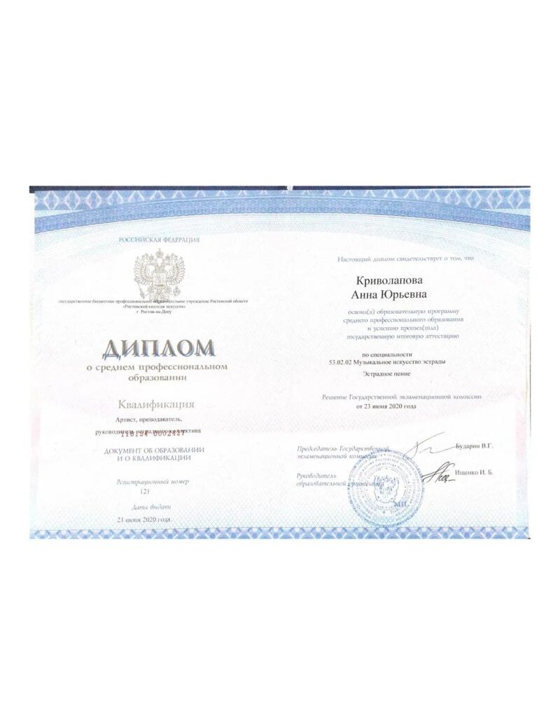- Ростовский колледж искусств, музыкальное искусство эстрады, эстрадное пение, 2015–2020 гг.