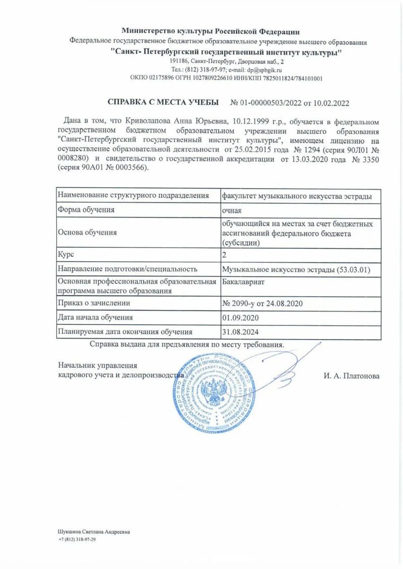 - Санкт-Петербургский государственный институт культуры, музыкальное искусство эстрады (с 2020 г.).