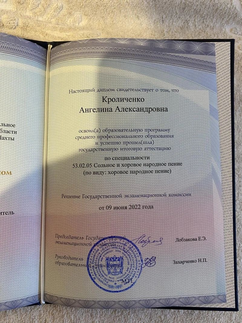 - ГБПОУ РО «Шахтинский музыкальный колледж», сольное и хоровое народное пение (по виду: хоровое народное пение), 2018–2022 гг.