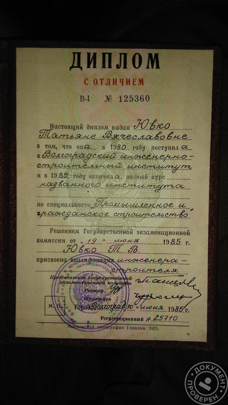 - Волгоградский инженерно-строительный институт, специальность – промышленное и гражданское строительство, диплом с отличием, 1985 год.
