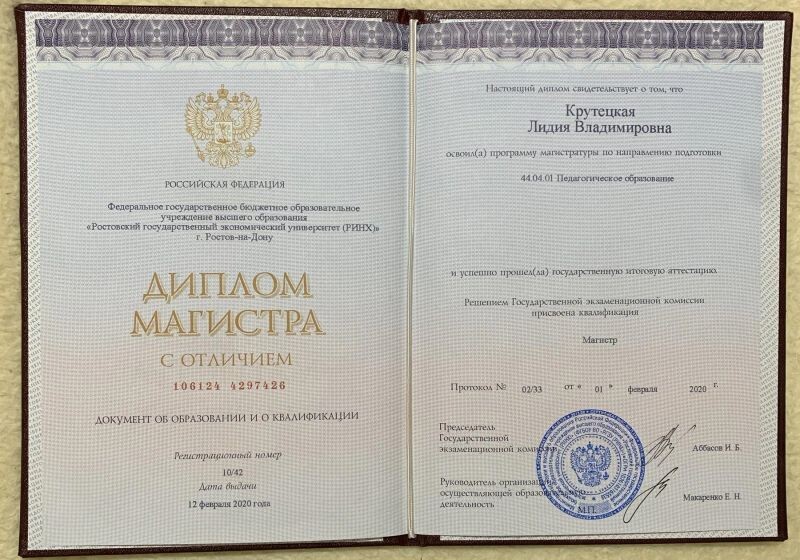 - Ростовский государственный экономический университет, педагогическое образование, диплом магистра с отличием, 2018–2020 гг.