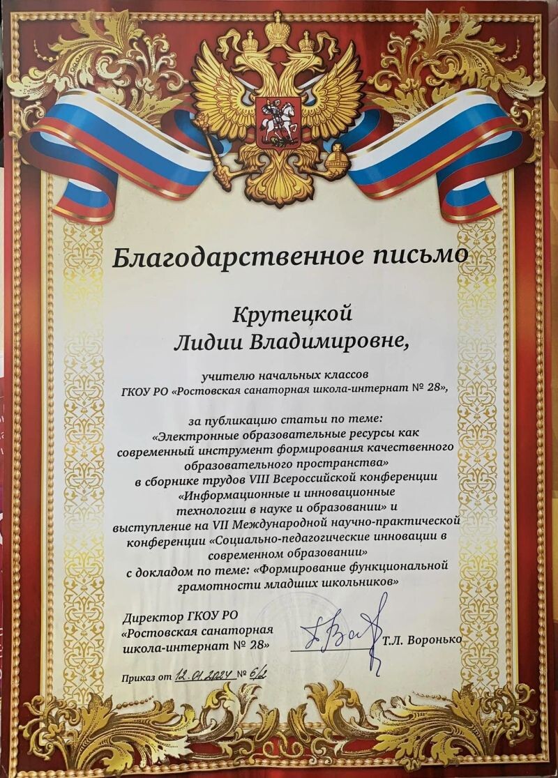 - Благодарственное письмо за публикацию статьи и выступление на VII Международной научно-практической конференции «Социально-педагогические инновации в современном образовании», 2024 г.