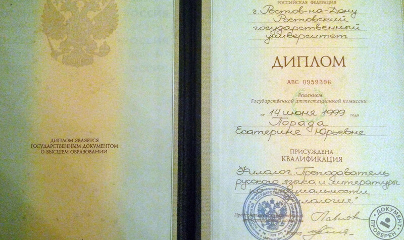 - В 1999 году окончила Ростовский государственный университет, факультет филологии и журналистики, отделение отечественной филологии, квалификация – филолог, преподаватель русского языка и литературы по специальности «филология».