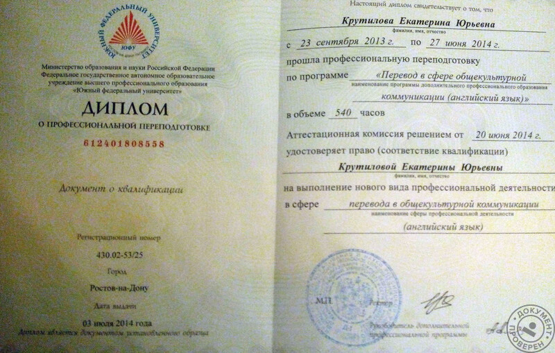 - Профессиональная переподготовка по программе «Перевод в сфере общекультурной коммуникации (английский язык)», Южный федеральный университет, диплом с отличием (2014 г.).
