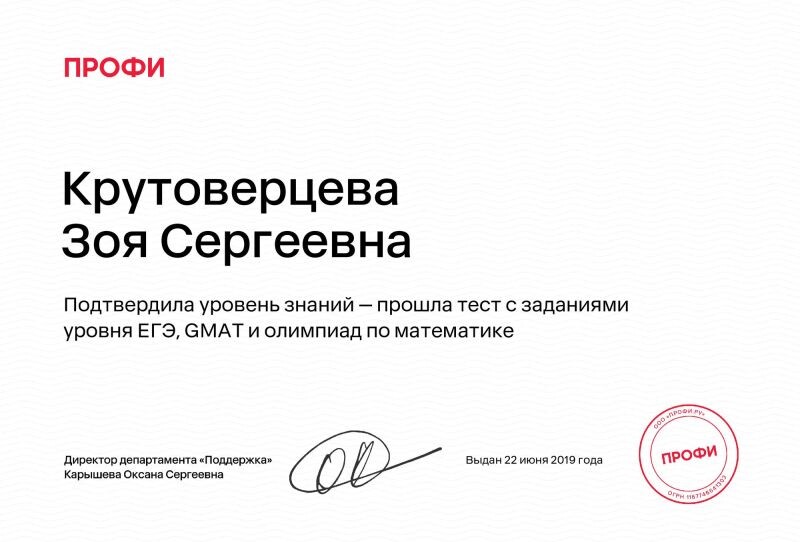 Хочу сказать огромное спасибо Зое Сергеевне за ее подход, внимание к ребенку, понимание той программы которую мы проходим в школе. Быстро подстраивается под просьбы ребенка, если контрольная тут же находит нужный материал и все тщательно прорабатывает. С данным преподавателям занимаемся по алгебре и геометрии, и будем продолжать дальше. Ребенок перестал бояться ходить на контрольные и тесты, потому что все стало с Зоей Сергеевной понятно.