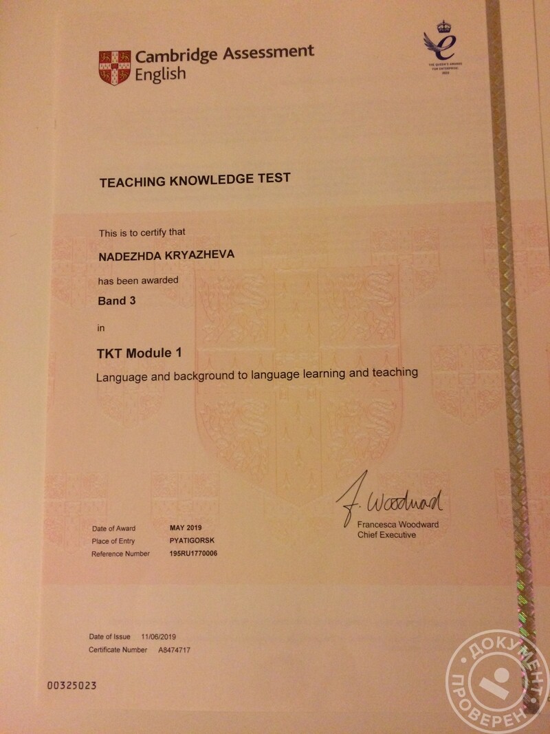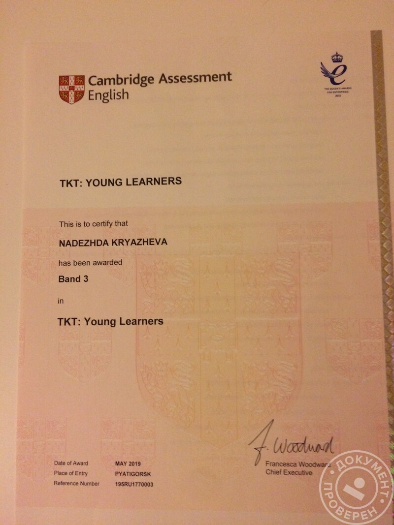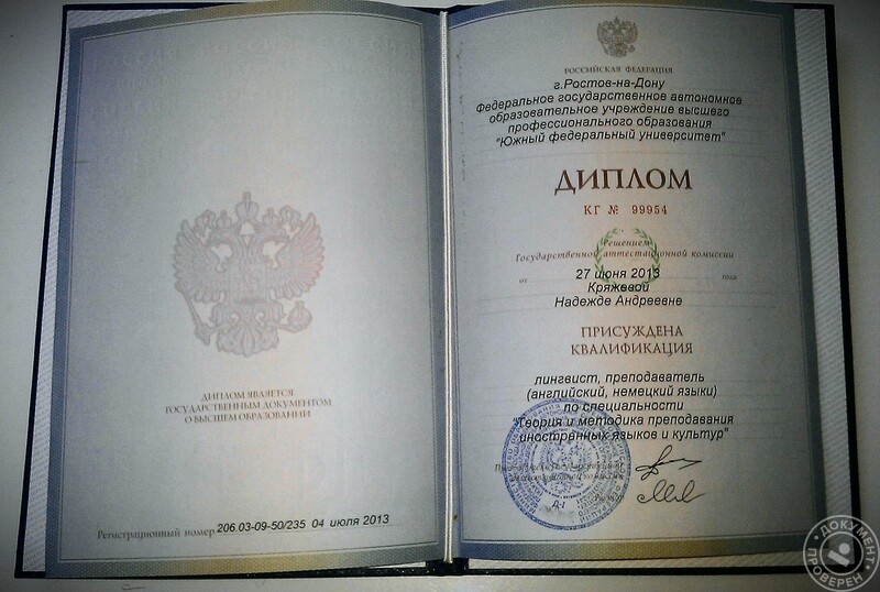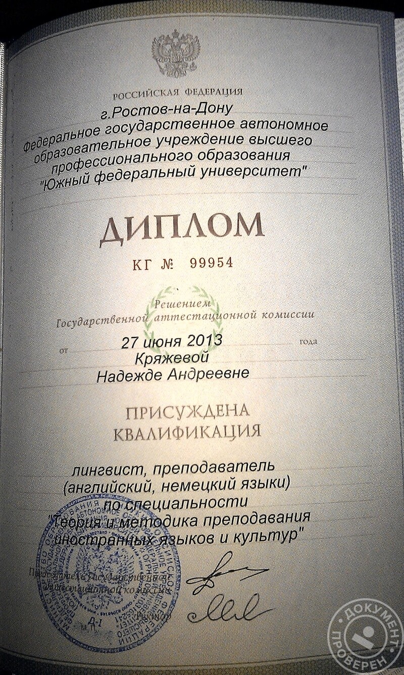 - Южный федеральный университет, факультет лингвистики и словесности, специальность – теория и методика преподавания иностранных языков и культур, 2013 г.