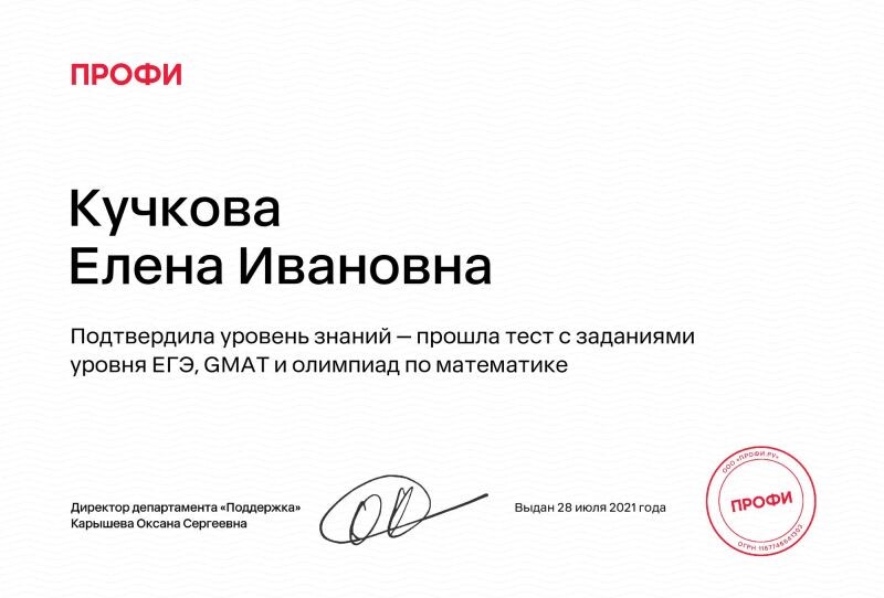 Большая благодарность Елене Ивановне за помощь в подготовке к ЕГЭ. Мой сын успешно справился с математикой, получив отличную оценку. Преподаватель очень грамотный и сумел наладить доверительное отношение с ребенком.