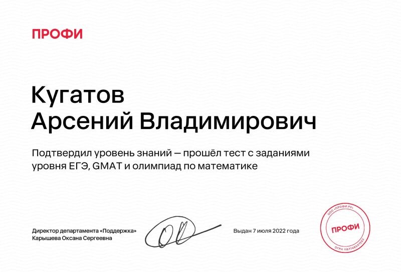 - Подтвердил уровень знаний — Прошёл тест с заданиями уровня ЕГЭ, GMAT и олимпиад по математике (с 2022 г.).
