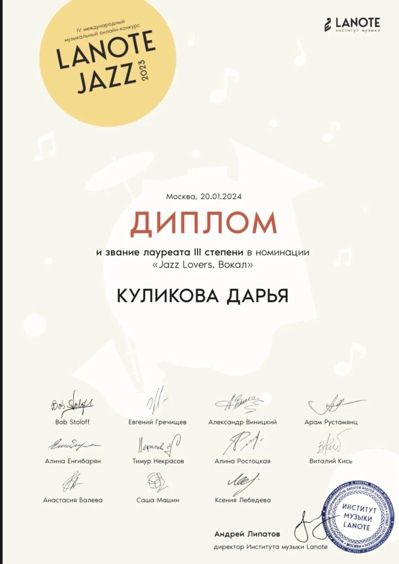 - IV международный музыкальный онлайн-конкурс LANOTE JAZZ, лауреат III степени в номинации «Jazz Lovers, Вокал», 2024 г.
