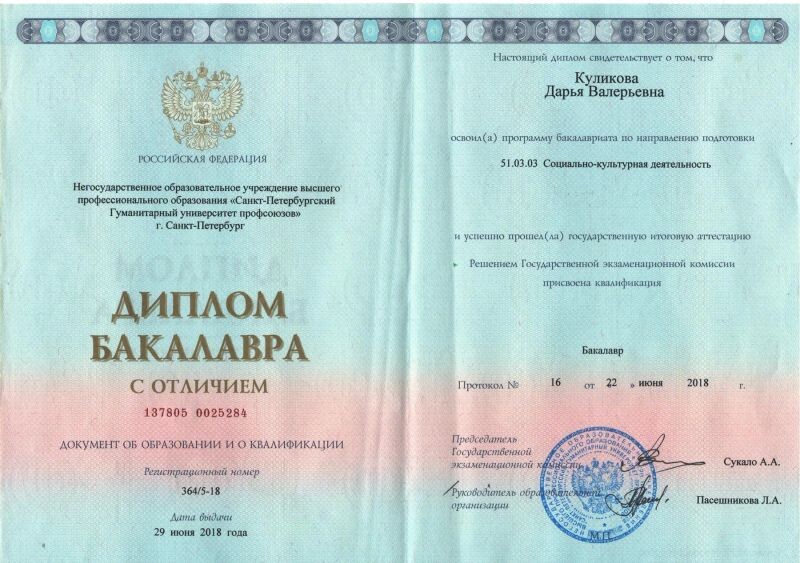 - Санкт-Петербургский гуманитарный университет профсоюзов, направление подготовки – социально-культурная деятельность, 2013–2018 гг.