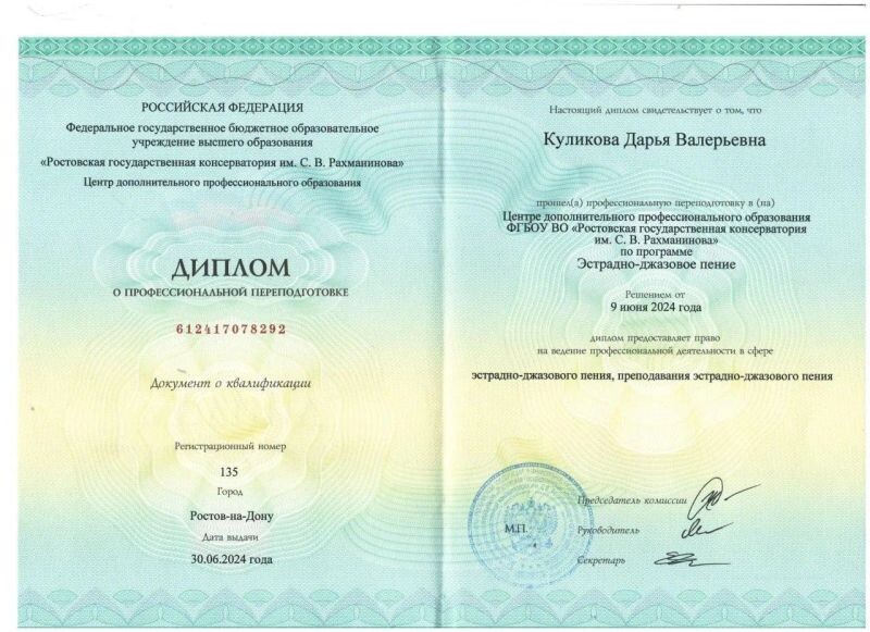 - Центр ДПО ФГБОУ ВО «Ростовская государственная консерватория им. С. В. Рахманинова», профессиональная переподготовка по программе профессионального образования «Эстрадно-джазовое пение», 2023–2024 гг.