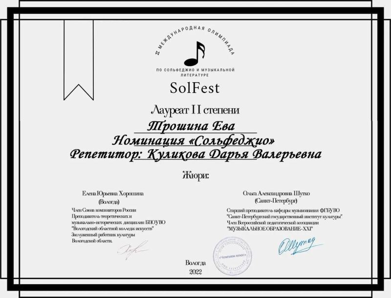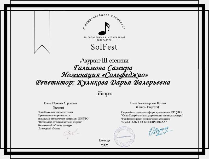 - Международная олимпиада, лауреат III степени, 2022 г.