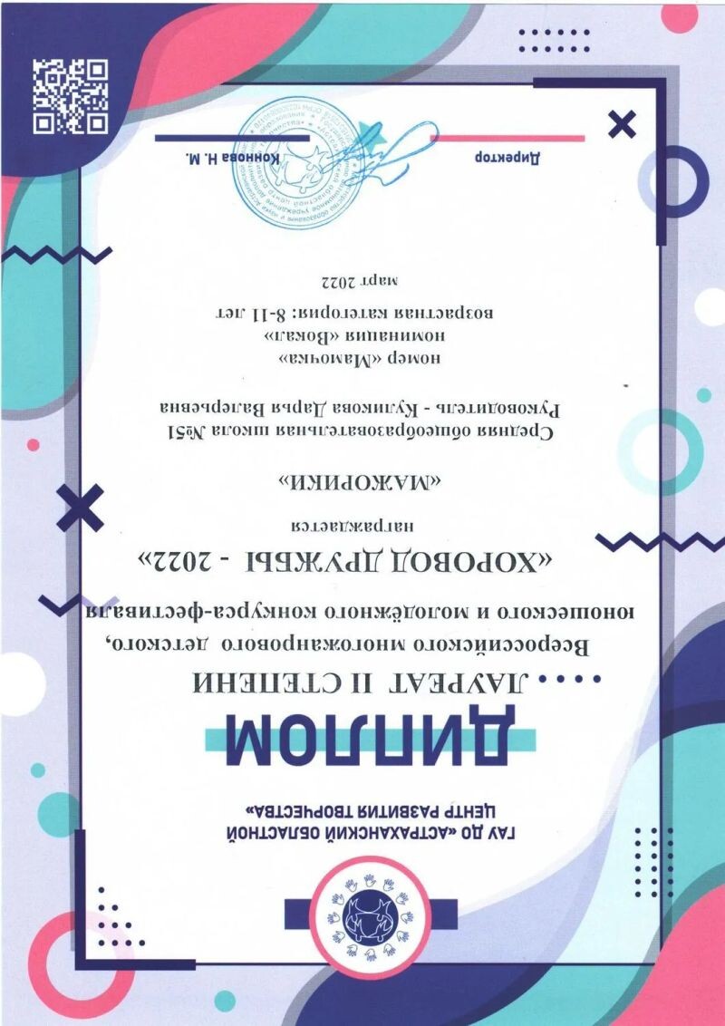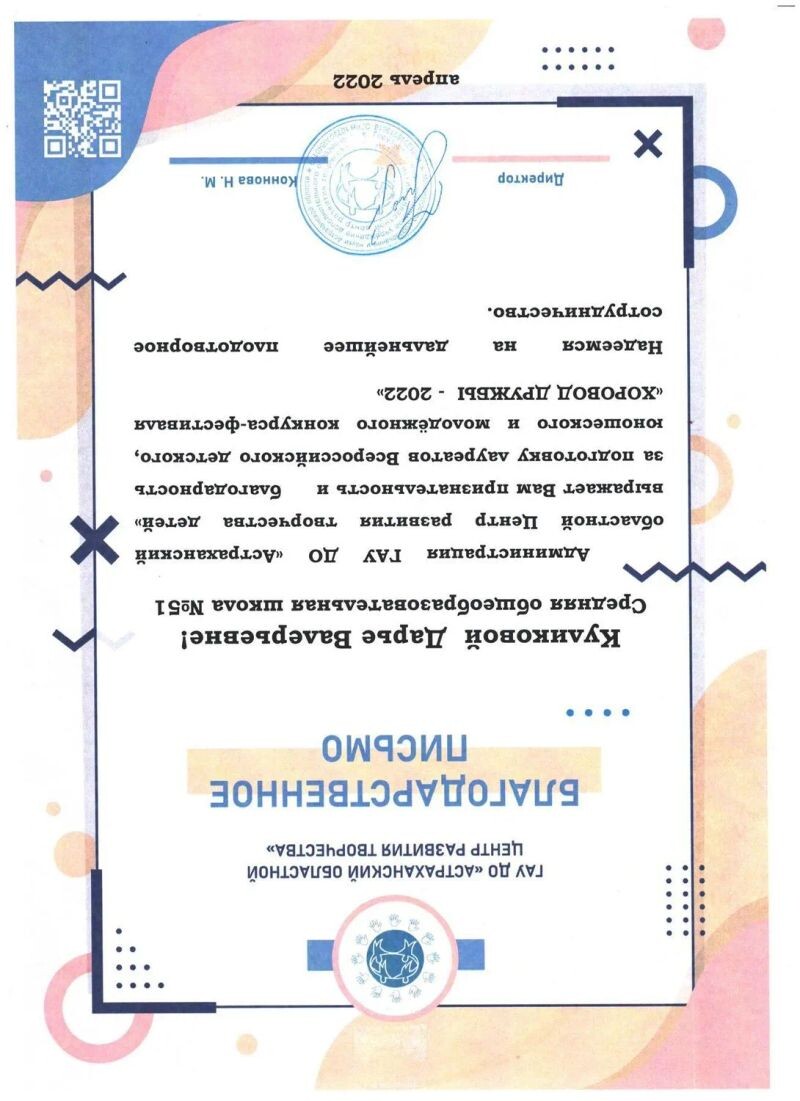- Астраханский областной центр развития творчества, благодарственно письмо, 2022 г.