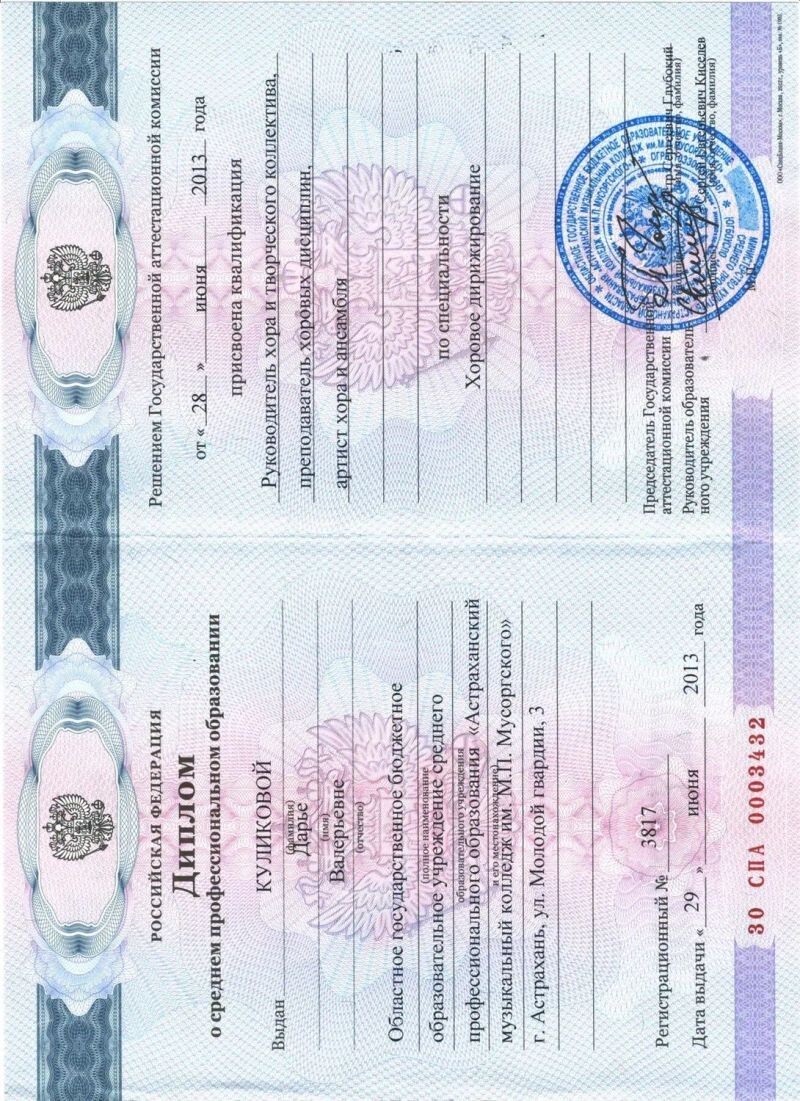 - Астраханский музыкальный колледж имени М.П. Мусоргского, отделение хорового дирижирования, квалификация – руководитель хора и творческого коллектива, преподаватель хоровых дисциплин, артист хора и ансамбля, 2009–2013 гг.