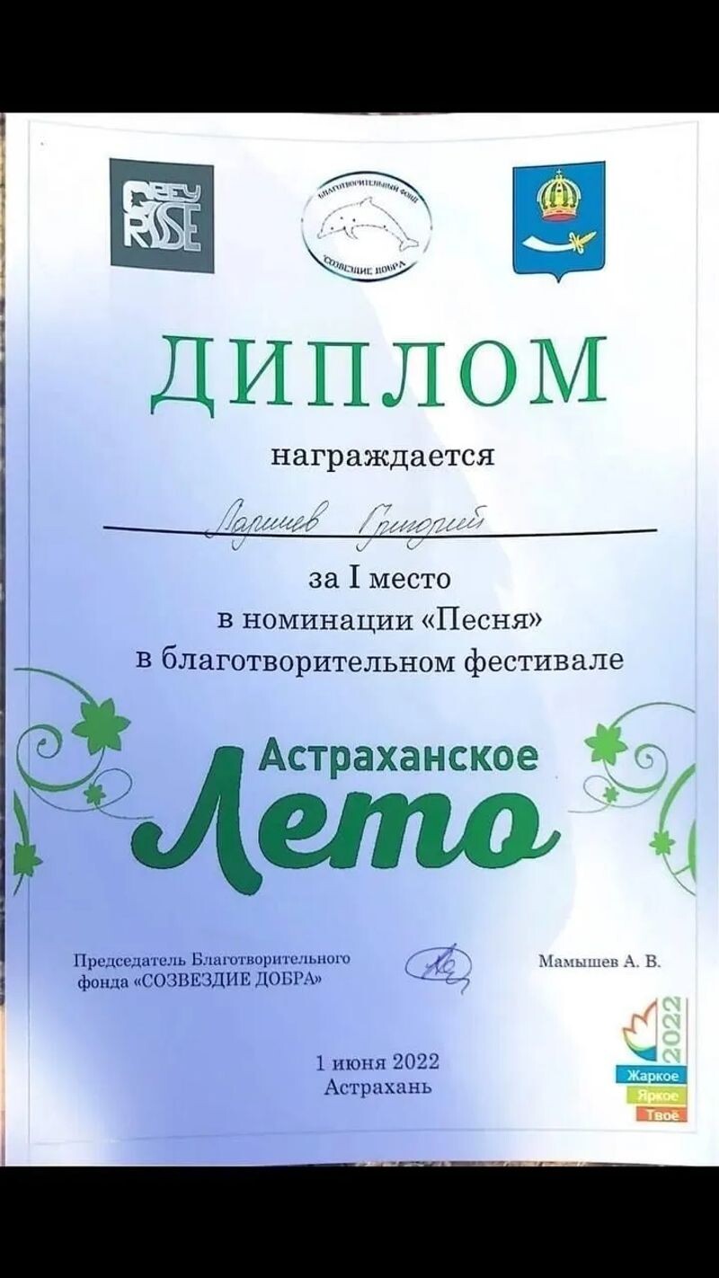 - Благотворительный фестиваль «Лето», диплом за I место, 2022 г.