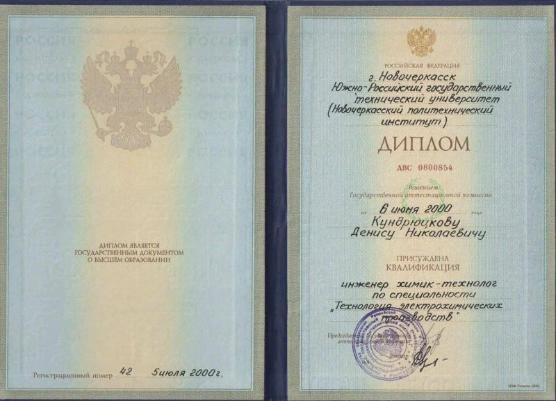 - Южно-Российский технический университет (Новочеркасский политехнический институт), химико-технологический факультет, инженер химик-технолог по специальности «Технология электрохимических производств», 1995–2000 гг.