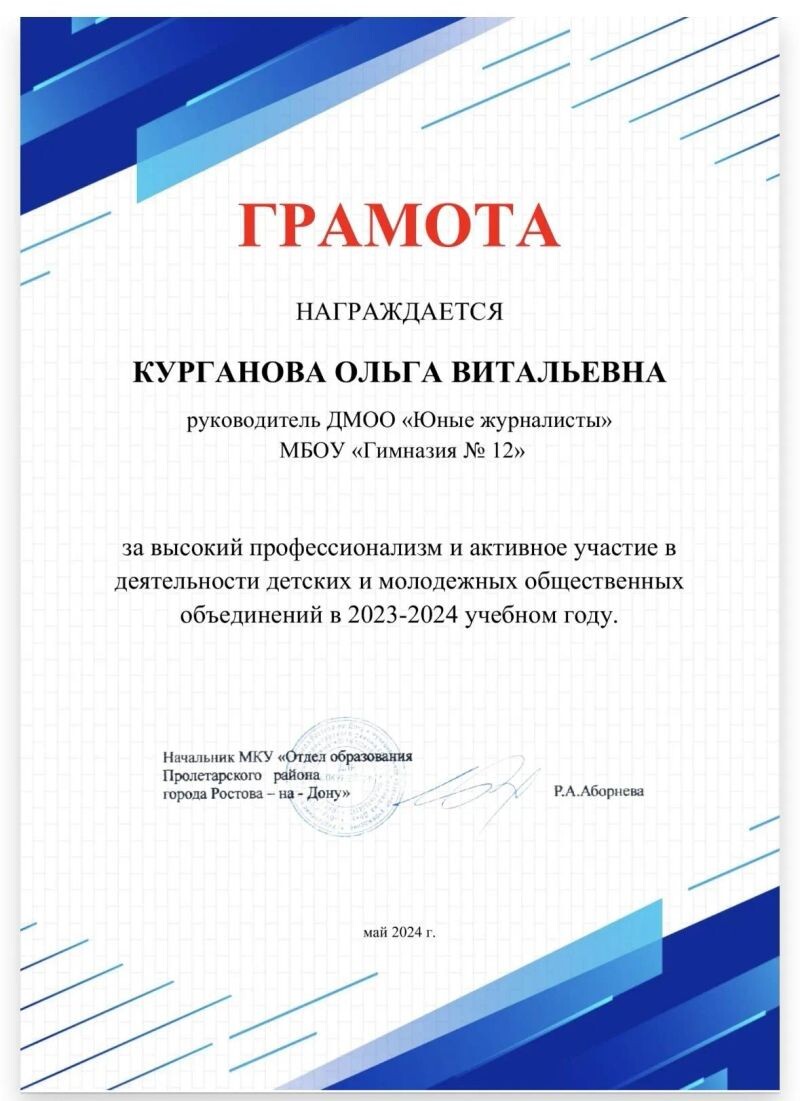 - Начальник МКУ «Отдел образования Пролетарского района города Ростова-на-Дону», грамота за высокий профессионализм и активное участие в деятельности детских и молодёжных общественных объединений в 2023-2024 учебном году.