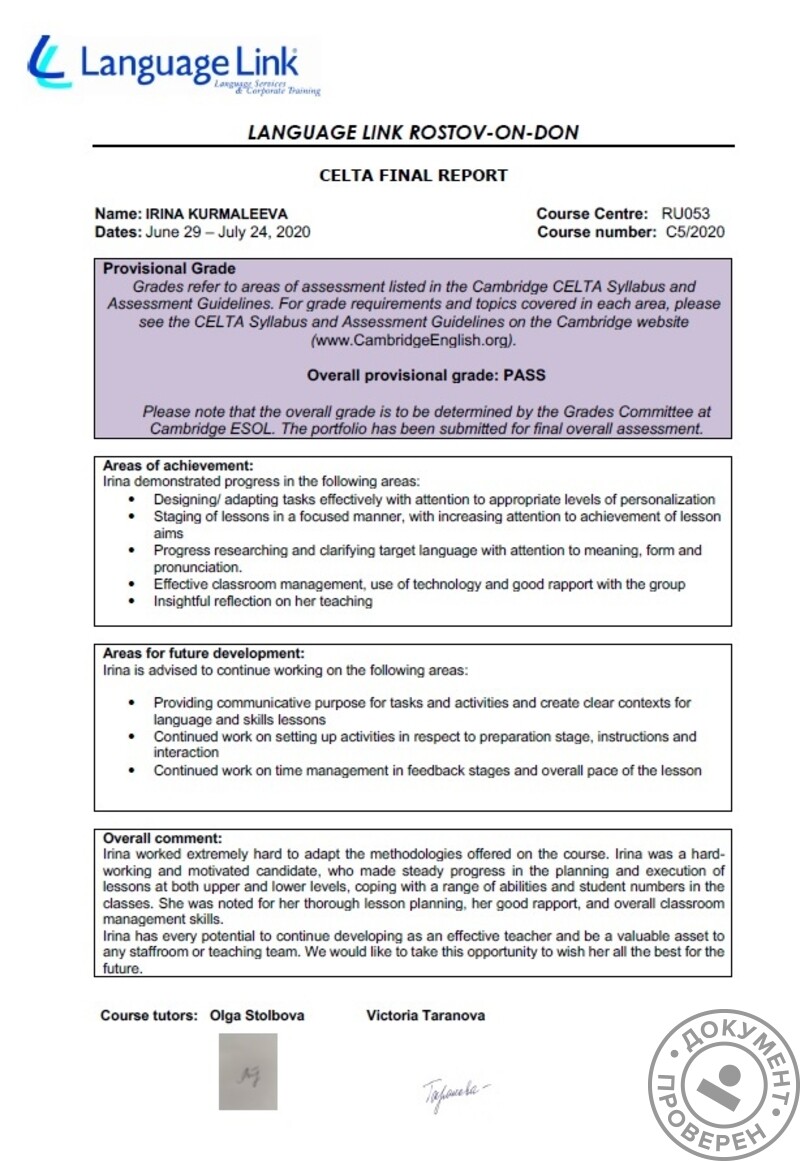 - Окончила Таганрогский государственный педагогический институт им. А.П. Чехова, факультет иностранных языков, по специальности – преподаватель английского, французского языков, 2014 г.