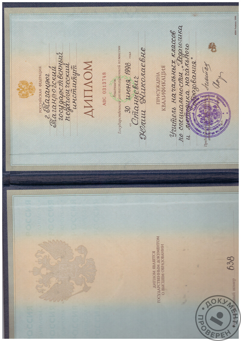- Таганрогский государственный педагогический институт им. А.П. Чехова, педагогика и методика начального образования, специализация – учитель начальной школы, 1998 г.