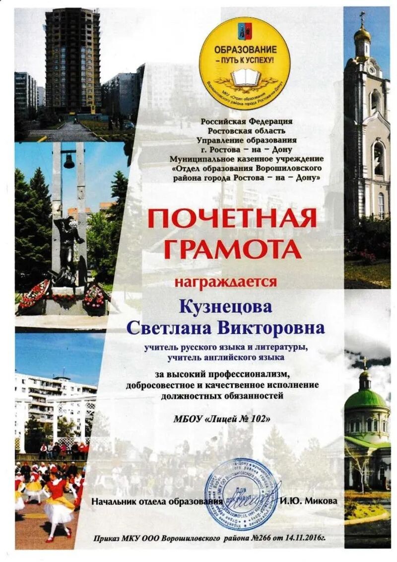 - Почётная грамота Управления образования г. Ростова-на-Дону за высокий профессионализм, 2016 г.