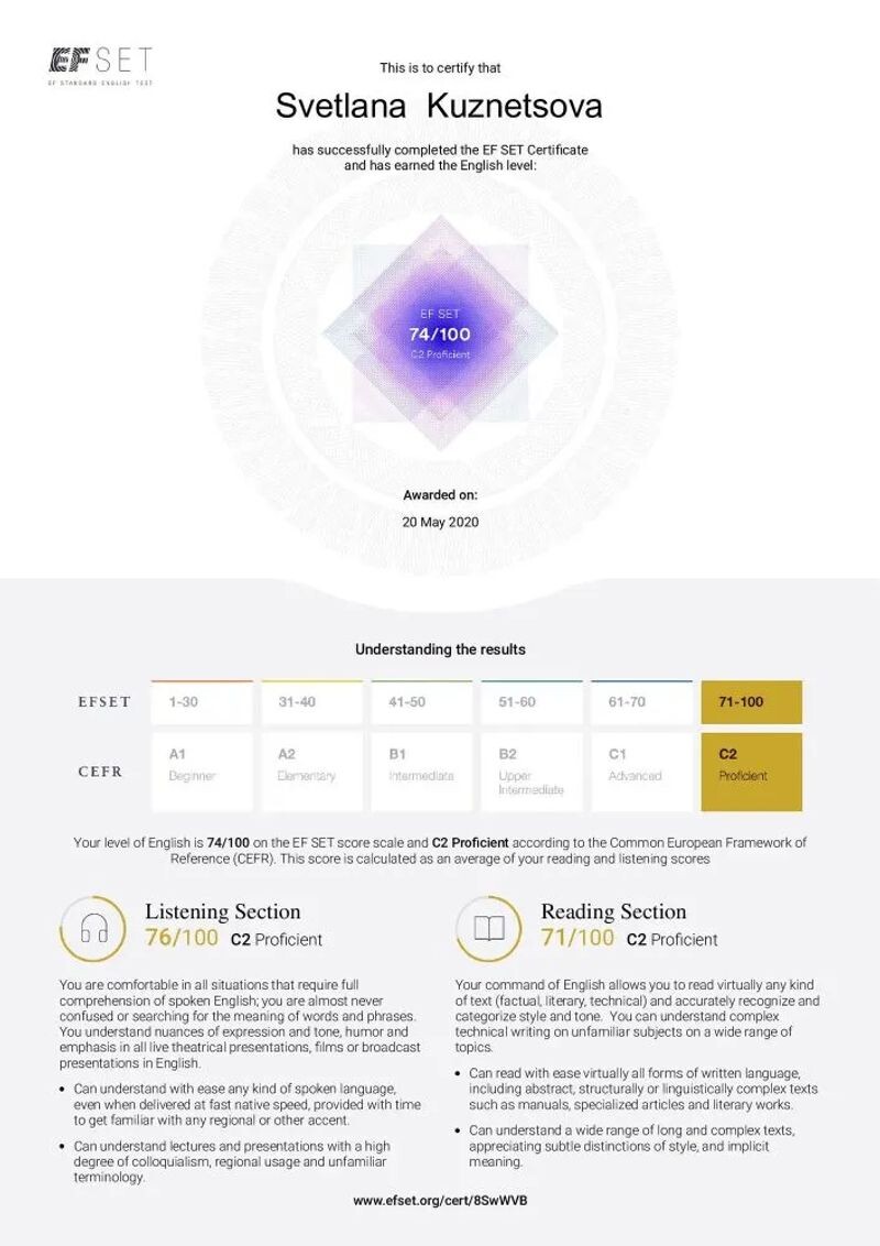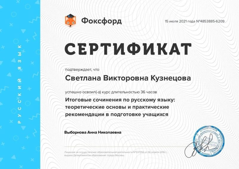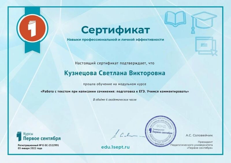 - Педагогический университет «Первое сентября», Москва, прохождение модульного курса повышения квалификации «Работа с текстом при написании сочинения: подготовка к ЕГЭ. Учимся комментировать», 2022 г.