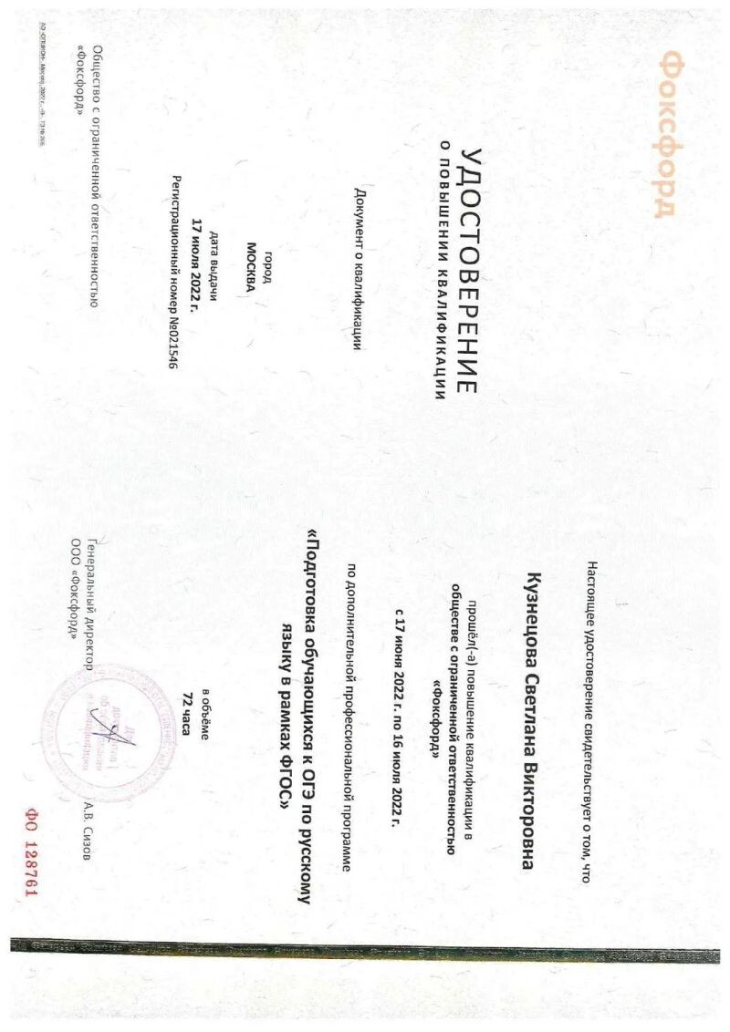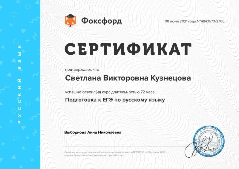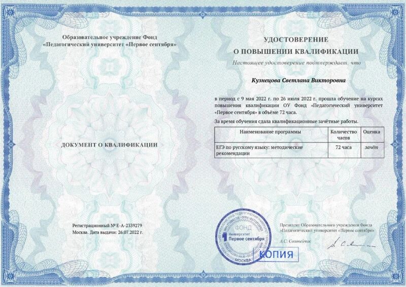 - Педагогический университет «Первое сентября», повышение квалификации по программе «Методика подготовки к ЕГЭ по русскому языку», 2022 г.