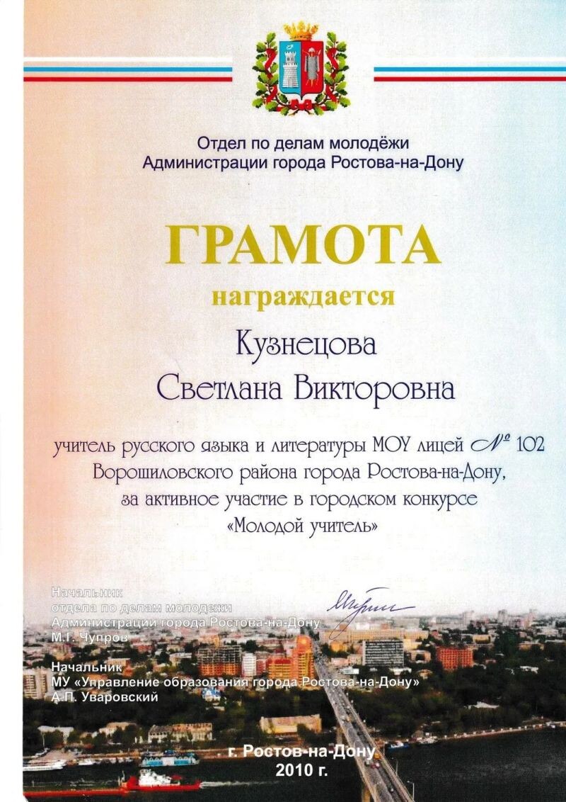 - Грамота администрации г. Ростова-на-Дону за активное участие в городском конкурсе «Молодой учитель», 2010 г.