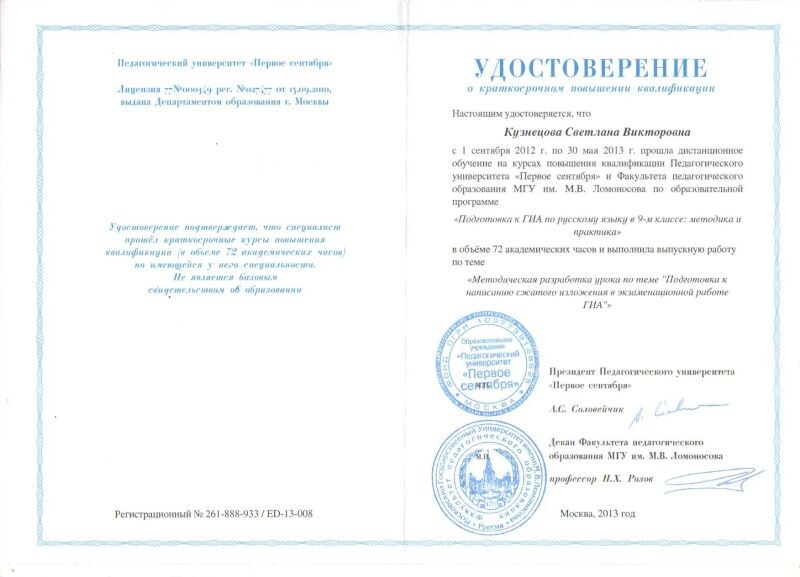- МГУ им. М.В. Ломоносова, Педагогический университет «Первое сентября», программа «Подготовка к ГИА по русскому языку в 9-м классе: методика и практика», 2012–2013 гг.