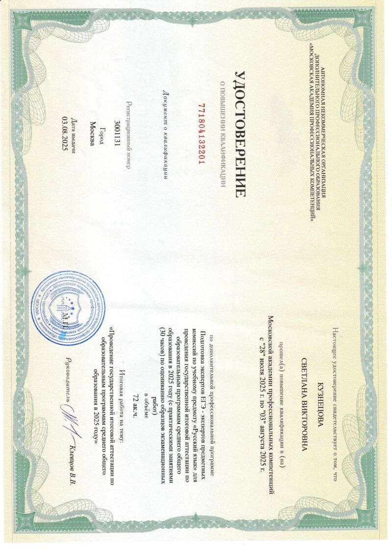 - Московская академия профессиональных компетенций, программа «Подготовка экспертов ЕГЭ-экспертов предметных комиссий по учебному предмету "Русский язык" для проведения государственной итоговой аттестации», 2025 г.