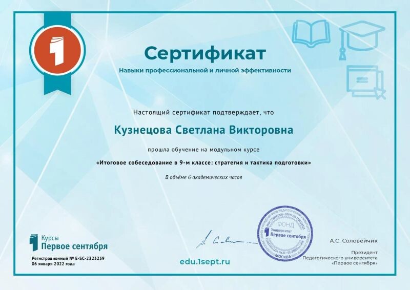 - Курсы «Первое сентября», курс «Итоговое собеседование в 9-м классе: стратегия и тактика подготовки», 2022 г.
